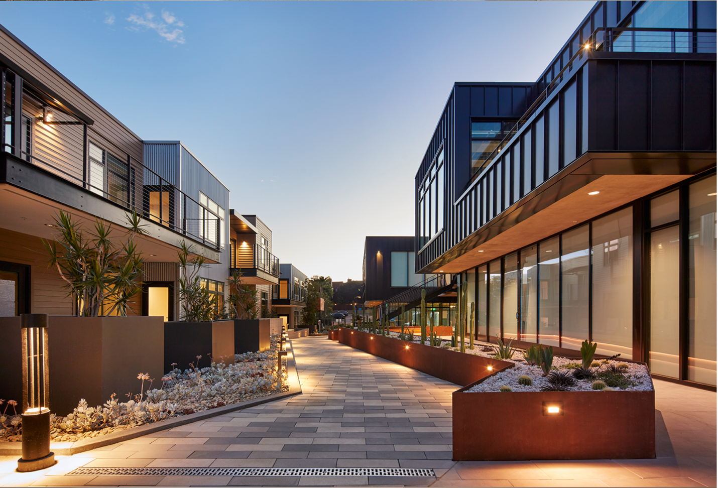 Central to The Sandbox is the expansive east-west open space plaza, which not only connects Highway 101 to Sierra Avenue but also serves as the heart of the development. This thoughtfully designed area is more than just a walkway; it’s a vibrant public space where natural elements and architectural innovation converge. By incorporating lush plantings, organic materials, and dynamic layouts, the plaza fosters an inviting atmosphere that encourages interaction and relaxation.