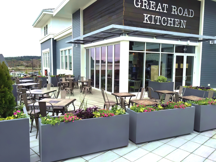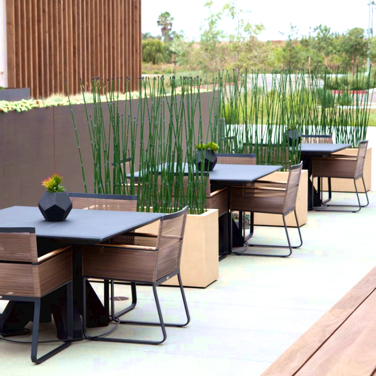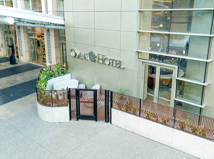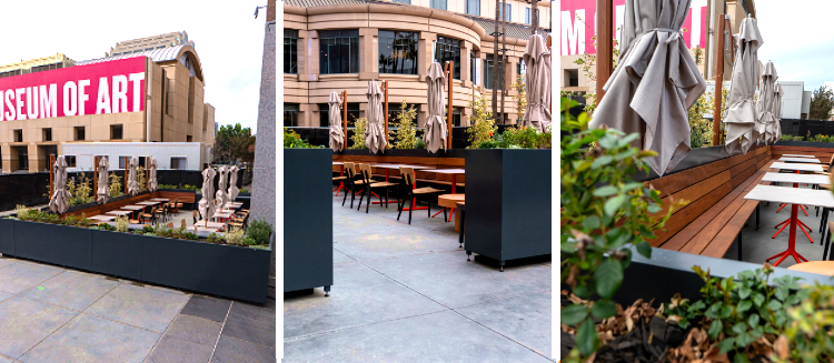 One way to create privacy is by using planters plus custom metal fabrication to create comfortable eating spaces for outdoor dining. To help the Omni Hotel in San Diego we used this solution to expand its sidewalk dining area. In partnership with Jeffrey Beers International, the final design incorporated durable Fiberstone planters in a modern Chenza finish, paired with high-quality steel privacy screens.